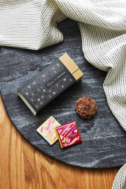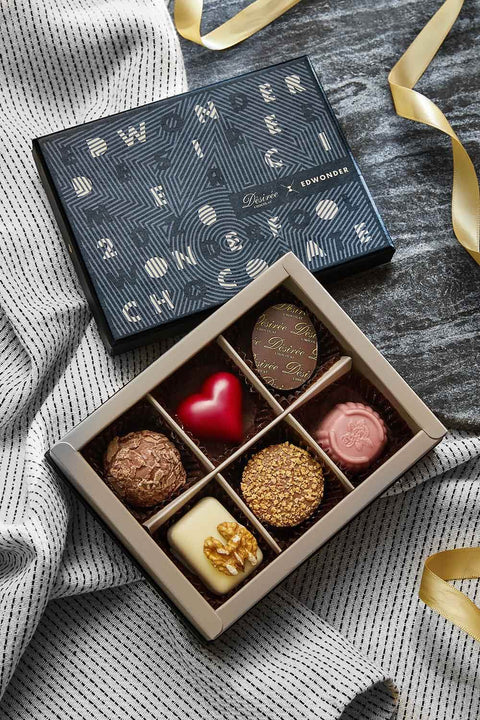 Dans cette boîte en édition limitée EdWonder X Déserée Wonderfool, trouvez 6 pièces savoureuses : Truffe : Une truffe au chocolat classique avec une ganache fondante exquise. Cœur Rouge : Praliné d'amande riche avec une saveur douce de chocolat blanc. Désirée : Chocolat noir avec caramel aromatisé au fruit de la passion frais. Galette : Crème de gianduja noisette soyeuse et légère sur une plaque de chocolat au lait lisse. Plaisir : Chocolat en deux couches lait et blanc, crème de noix pour une saveur plus riche. Fleurage : Crème de noisette enveloppée dans un chocolat rubis éclatant, combinée à une acidité fruitée pour une finale nette.