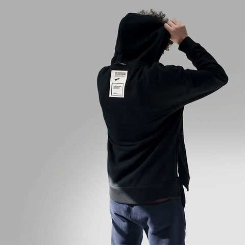 Black long sleeve French Terry hoodie with side zippers. Featuring Kangaroo pockets at waist and rib knit cuffs and hem.
